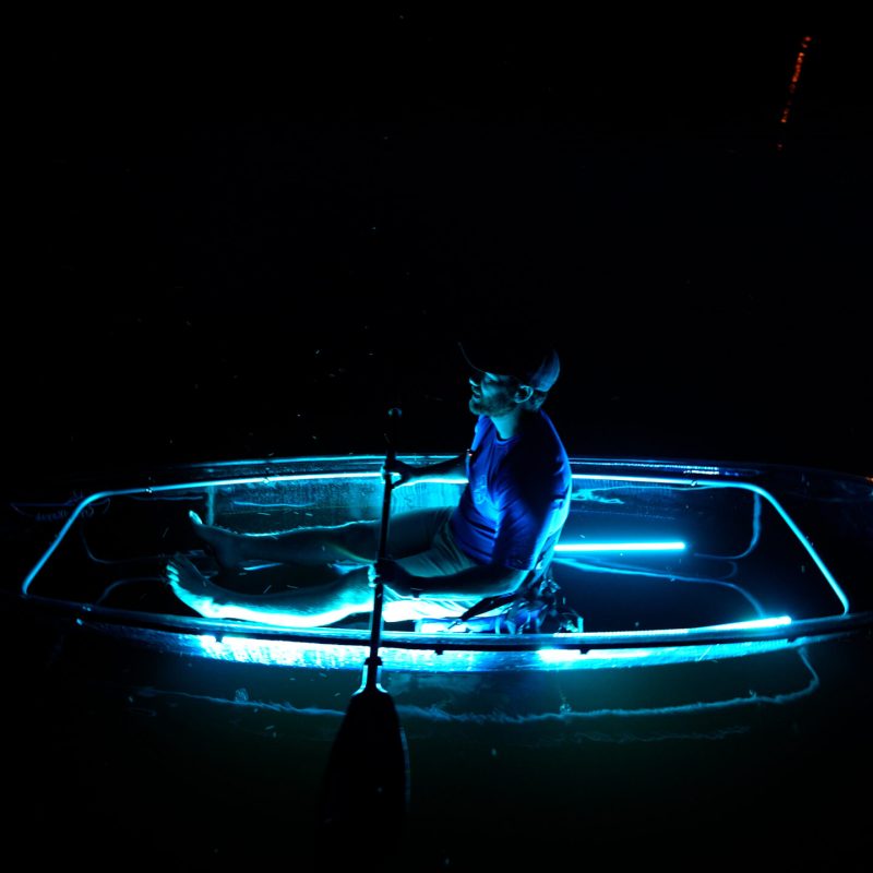 Light up the night in this one of a kind glow-in-the-dark clear kayak experience! Enjoy the relaxing waters of Old Hickory Lake as the sun disappears behind the horizon and turn on our LED lights to enhance the adventure. Watch the waters around you glow as you glide through the night. This is the perfect adventure for a date night, thrill seeker, or anyone looking for a clearly unique adventure!