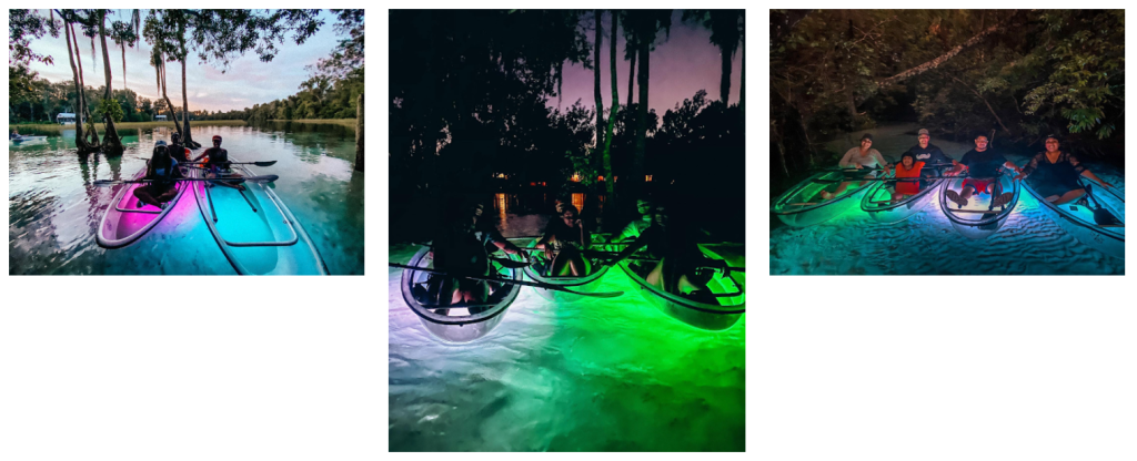 4. After dark GLOW. Luckily Get Up and Go Kayaking Rainbow Springs will be starting their Get Up and GLOW tours in March! This allows you to experience Rainbow River in a unique way. After the sun goes down you will light up Rainbow River with waterproof LED lights in the base of your clear kayak. Just look at these photos! Bucket list goals for sure.